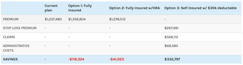 First we looked at two fully insured plans. One was a contribution plan and the other was a high-deductible plan with a Health Reimbursement Account which could be viewed as a baby step toward self-funding. Next we explored the idea of a self-funded plan, with a deductible of $30,000. The self-funded experts at R&J Insurance used their experience to work with several A+ rated reinsurers and Third Party Administrators (TPAs) specializing in self-funding. We were able to show the same plan design with a United Health Care network.